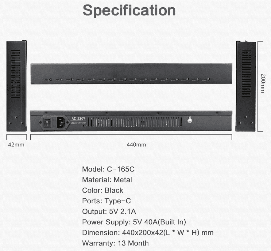 ⚡ Ladestation 19 Zoll – Profi-USB Ladegerät mit 16 Ports & 200W Power